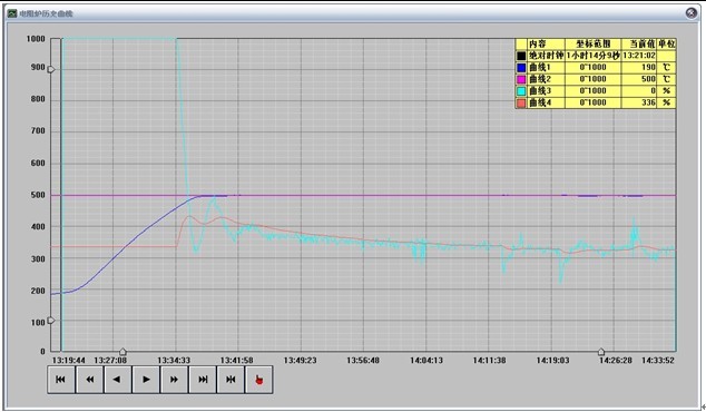 仪表初始显示温度181℃,开启时间程序升温至200℃能正确受控,温度上升段控制输出摆幅较大,且随着控制时间的延长,超调幅值越来越小。 |