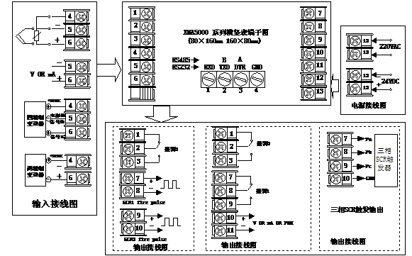 XMA-5000系列智能数字显示PID调节器,可控硅(SCR)三相过零触发脉冲输出,K分度号输入,显示量程0~1300℃,供电电源220VAC,带RS232隔离通讯接口。