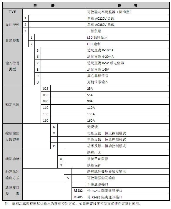 TYE1000/2000 系列标准型单相晶闸管功率调整器适用于各种阻性负载和感性负载,主要 用于各种电加热装置的加热功率调整,既可以手动调整,又可以和电动调节仪表、智能调节 仪表、PLC 及计算机控制系统配合。