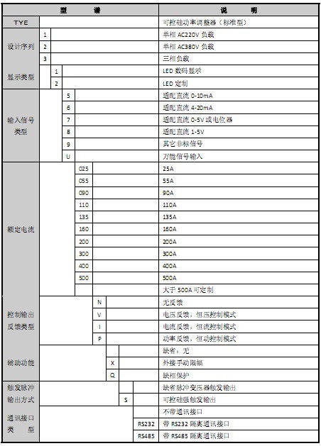 额定电流:25A、55A、90A、110A、135A、160A、200A、300A、400A、500A 可控硅控制输出:移相控制、定周期过零控制、变周期过零控制,适用于阻性负载和感性负载。
